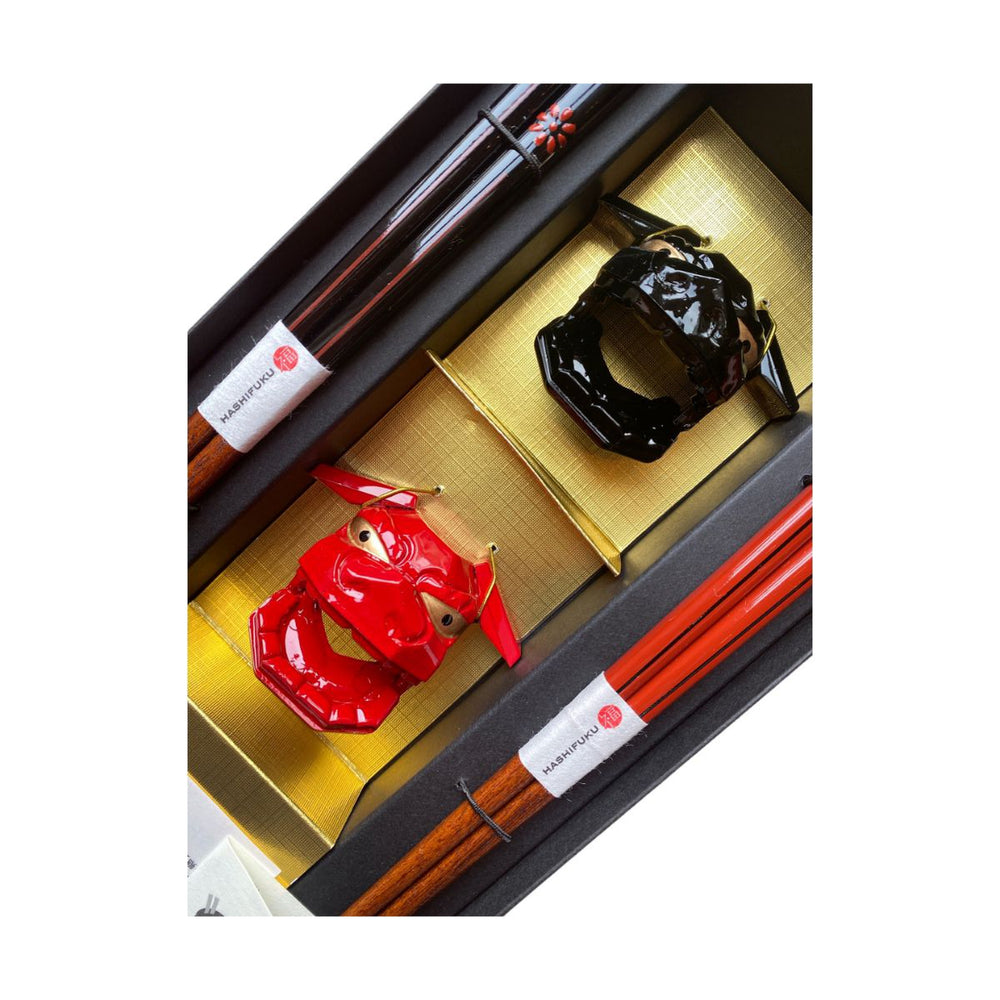 Crafted by Wakasa craftsmen this premium chopstick gift set contains two pairs of wooden chopsticks decorated in Kikukomon (chrysanthemum emblem of the imperial family in Japan) along with 2 with two beautiful Shishimai rests neatly packaged and boxed.
