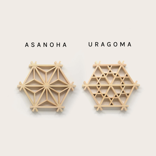 Like most kumiko motifs, the Asanoha and Uragoma designs are inspired by nature. The Asanoha pattern represents the hemp plant, which symbolizes growth and vitality. The Uragoma pattern depicts the opening of a pod of sesame seeds, which was regarded to have high medicinal value when first introduced to Japan in the 6th century, symbolizing a healthy and long life.