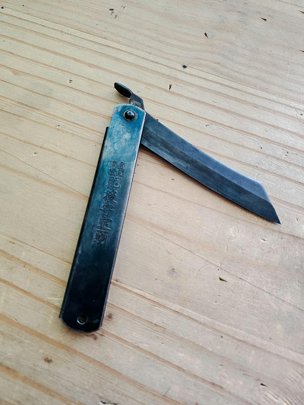 This Japanese Higonokami knife has a core of Japanese Aogami # 1 "Blue paper" carbon steel (non-stainless). This double-sided sharpened knife is completely forged by the only master blacksmith who is allowed to make Higonokami knives (M Nagao). The blade is sturdy and manually sharpened and is very easy to sharpen yourself. This edition has a notch in the handle to make it easier to remove the knife from the handle.