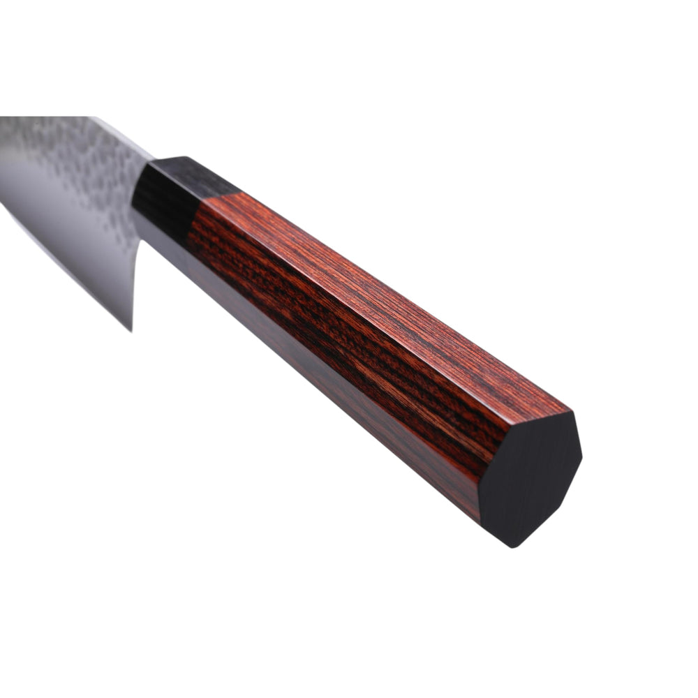 The knife incorporates a “Hamaguri” shaped blade, originating from the Samurai sword, that let you cut effortlessly in a straight line. The detailed hammer-forged patterns on the blade reflect traditional bladesmithing techniques.