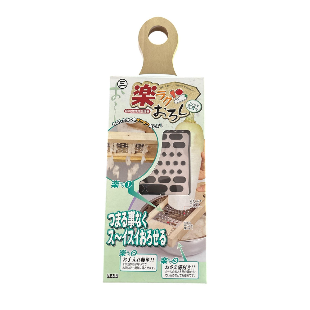 The Marusan Rakuraku Grater is a traditional handmade wooden Japanese kitchen tool designed for effortless grating of daikon radish, ginger, wasabi, carrots, apples, and other ingredients. Its name “Rakuraku” translates to “easy and comfortable,” reflecting the smooth and efficient grating experience it delivers.