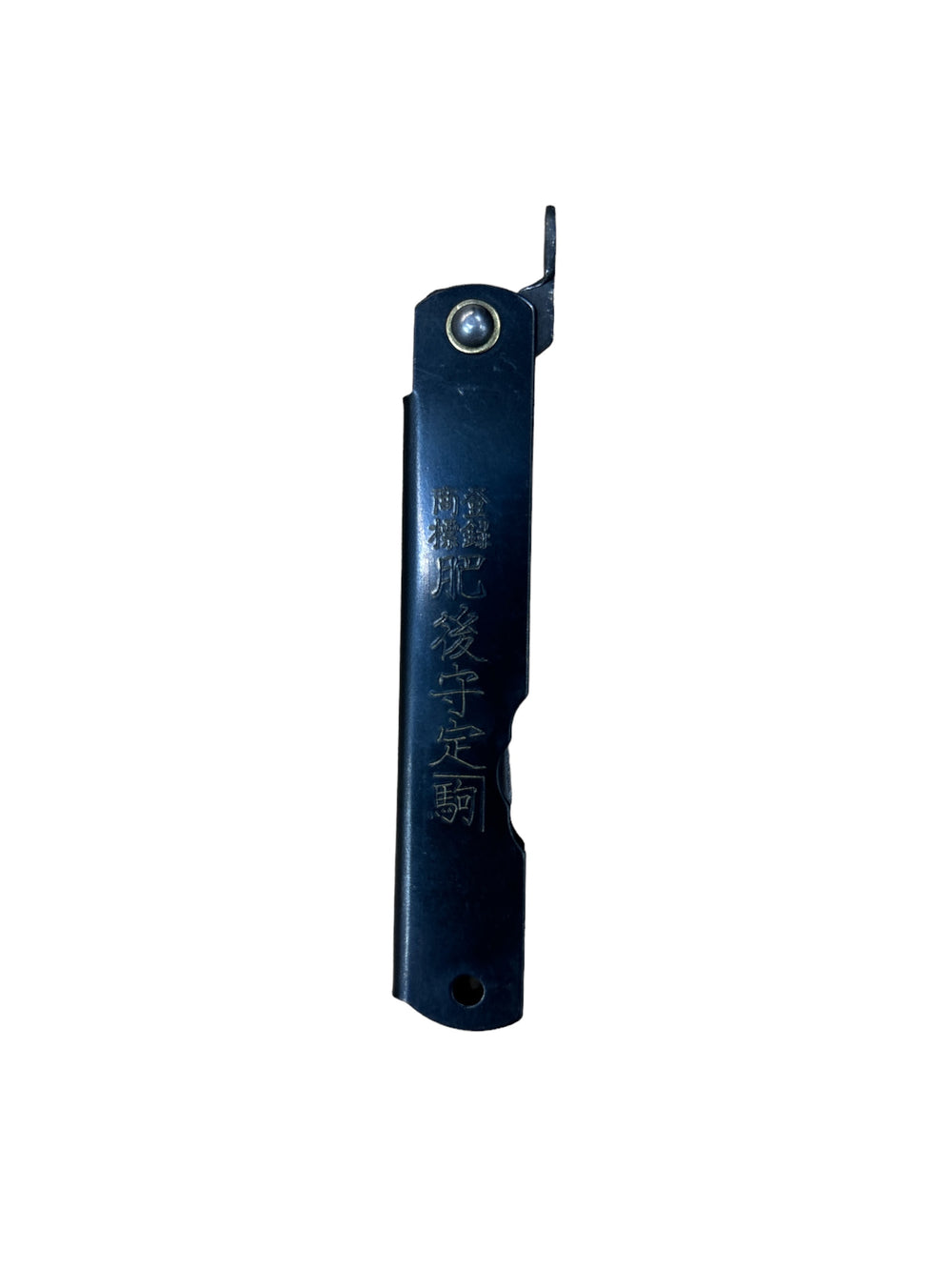 This Japanese Higonokami knife has a core of Japanese Aogami # 1 "Blue paper" carbon steel (non-stainless). This double-sided sharpened knife is completely forged by the only master blacksmith who is allowed to make Higonokami knives (M Nagao). The blade is sturdy and manually sharpened and is very easy to sharpen yourself. This edition has a notch in the handle to make it easier to remove the knife from the handle.