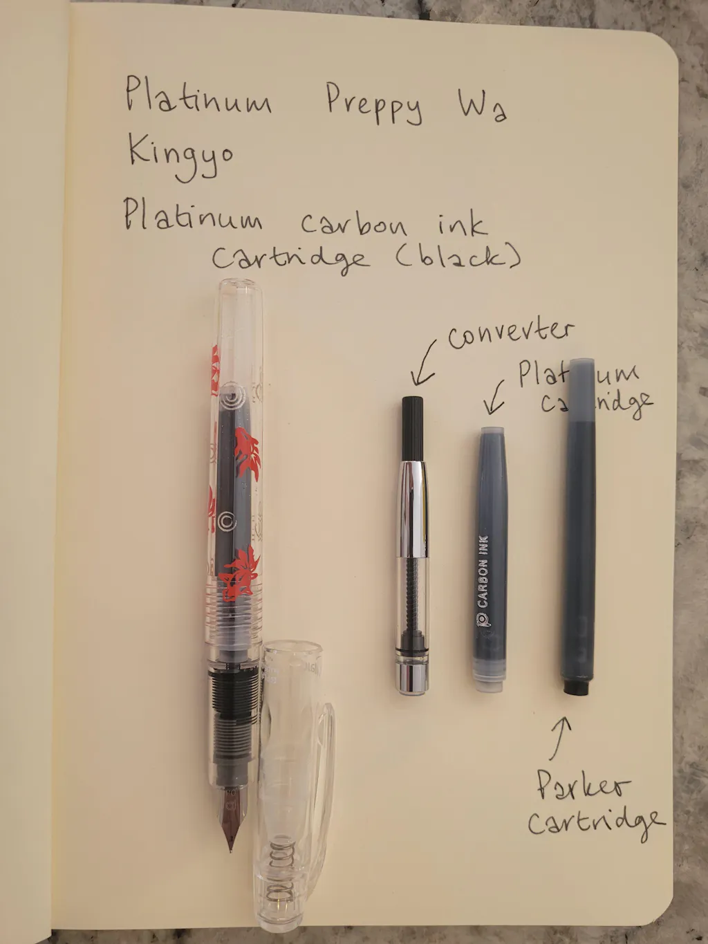 I bought the Kingyo pattern pen because I like to see how much ink I have left. It has a nice weight to it, fits well in the fingers, and writes like a dream. The tip is quite fine and has a slight "scratch" when writing, which I personally enjoy. I also bought the Platinum converter and carbon ink cartridges, which seem shorter than standard (e.g. Parker, Pelikan) although it looks like the pen can accommodate the longer sizes.